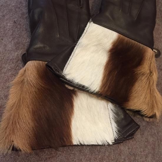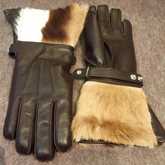 カフスにスプリングボックヘアーを採用した、ガントレット・グローブのハイエンドモデル。甲部分に柔らかいクロムなめしのホースソフト、ライニングにはウールボアを採用し、間にペフを挟むことで防寒性、保温性にも優れる。手元を引き立てるラグジュアリーな一双として完成した。